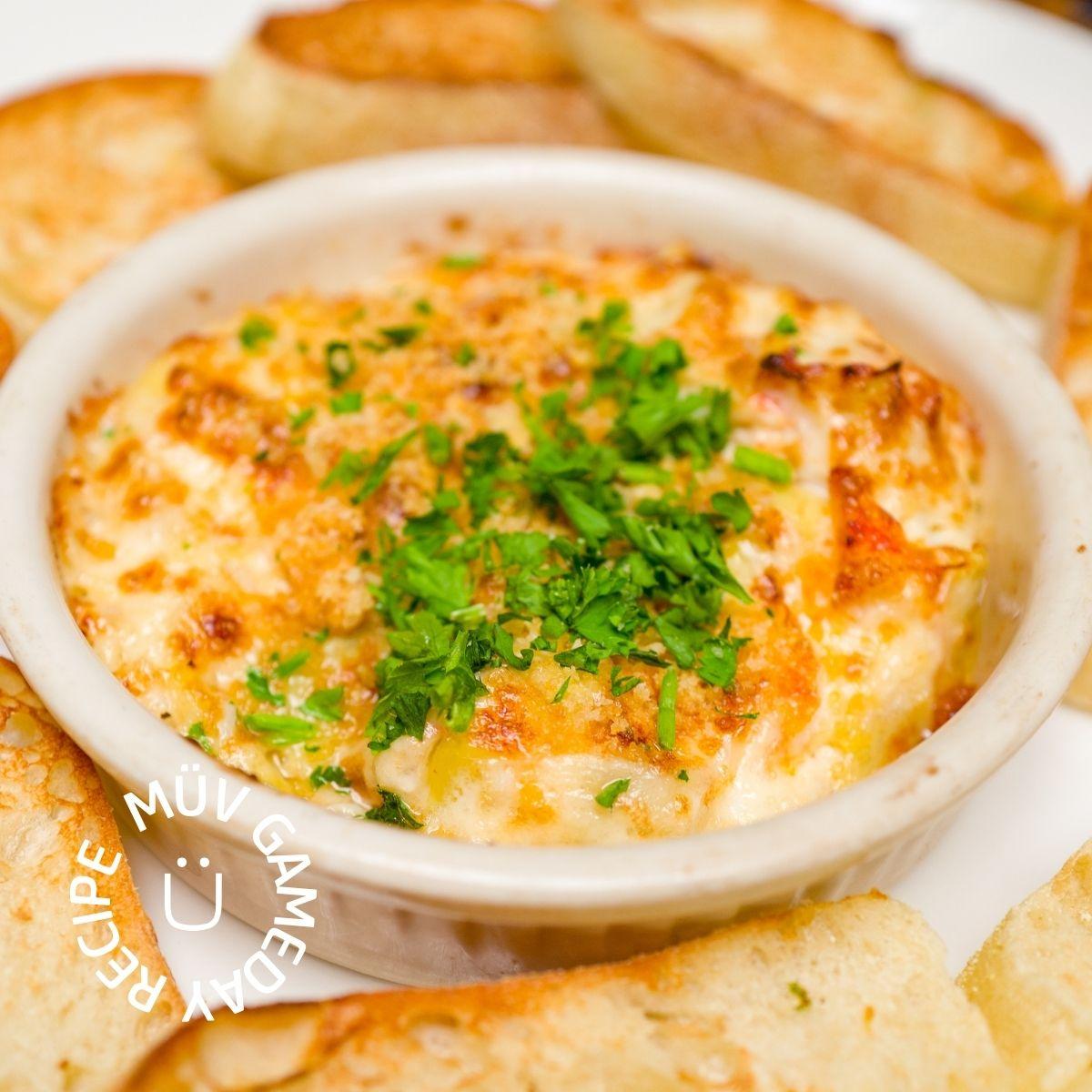 7. Carefully remove the dip from the oven (the dish will be hot) and let it cool for a few minutes before serving. Eat warm with toasted baguette slices, tortilla chips, and vegetable sticks for dipping.